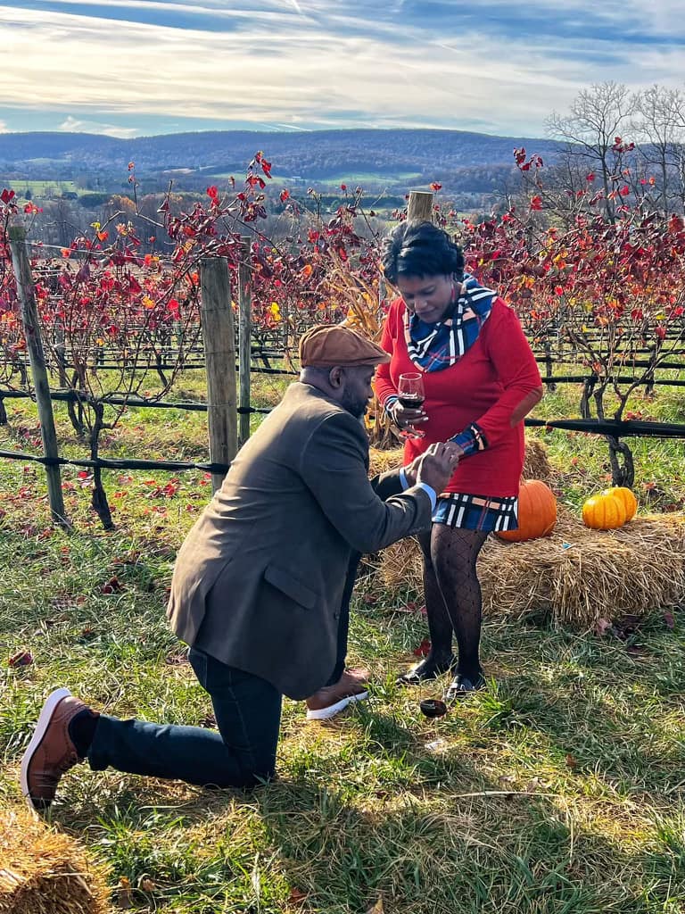 On their second anniversary, during another trip to Virginia (mirroring their early days), Carl proposes during a private chauffeured wine tour at Hillsboro Winery.